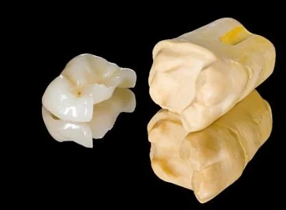Onlays are used when more structure is needed to be replaced than an inlay, but it is still not enough structure to be called a crown. We like onlays because they can enable us to save the tooth, actually strengthening it, without having to resort to a crown.The Onlay just like the inlay can be made out of ceramic (ex: emax) or metals (ex: gold). They take two appointmetnts to fabricate. This is an important option to consider because we should always conserve the maximum amount of tooth structure. Making the onlay of ceramic/porcelain allows the restoration to be bonded to the tooth. This bonding process may actually improve the strength of the tooth and help seal the onlay to the tooth.